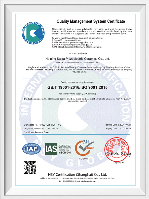 O atomizador ultrassônico é um dispositivo que utiliza o princípio da vibração ultrassônica (conversão de energia) para converter líquido em pequenas gotículas. O princípio de funcionamento são as propriedades piezoelétricas exclusivas da cerâmica piezoelétrica da decisão, a peça de atomização no recebimento da excitação do sinal de campo elétrico correspondente, produzirá a frequência de oscilação correspondente, através do papel da vibração de alta frequência da cavitação líquida jogada fora da superfície da água para produzir uma espécie de partículas de névoa de água, atomizadas com um grande número de íons negativos e pequenas partículas de moléculas, pode alcançar um aumento da umidade ambiente, o papel do ar fresco. A superfície do atomizador é revestida com esmalte vítreo a uma alta temperatura de 800 graus para proteger os eletrodos de prata da folha piezoelétrica, aumentar a resistência a ácidos e álcalis e a resistência à oxidação do atomizador e aumentar a vida útil do atomizador. Amplamente utilizado em umidificadores internos, purificadores de ar, tratamento médico com nebulizadores e carros de beleza, e e outros campos, mas também adequado para armazéns, fábricas, umidificação, desinfecção, para criar a atmosfera de equipamentos de umidificação. Os comprimidos de nebulização são usados principalmente em umidificação industrial, nebulização médica, nebulização de aromaterapia, umidificação ambiental, nebulização de jardim e outras cenas.
